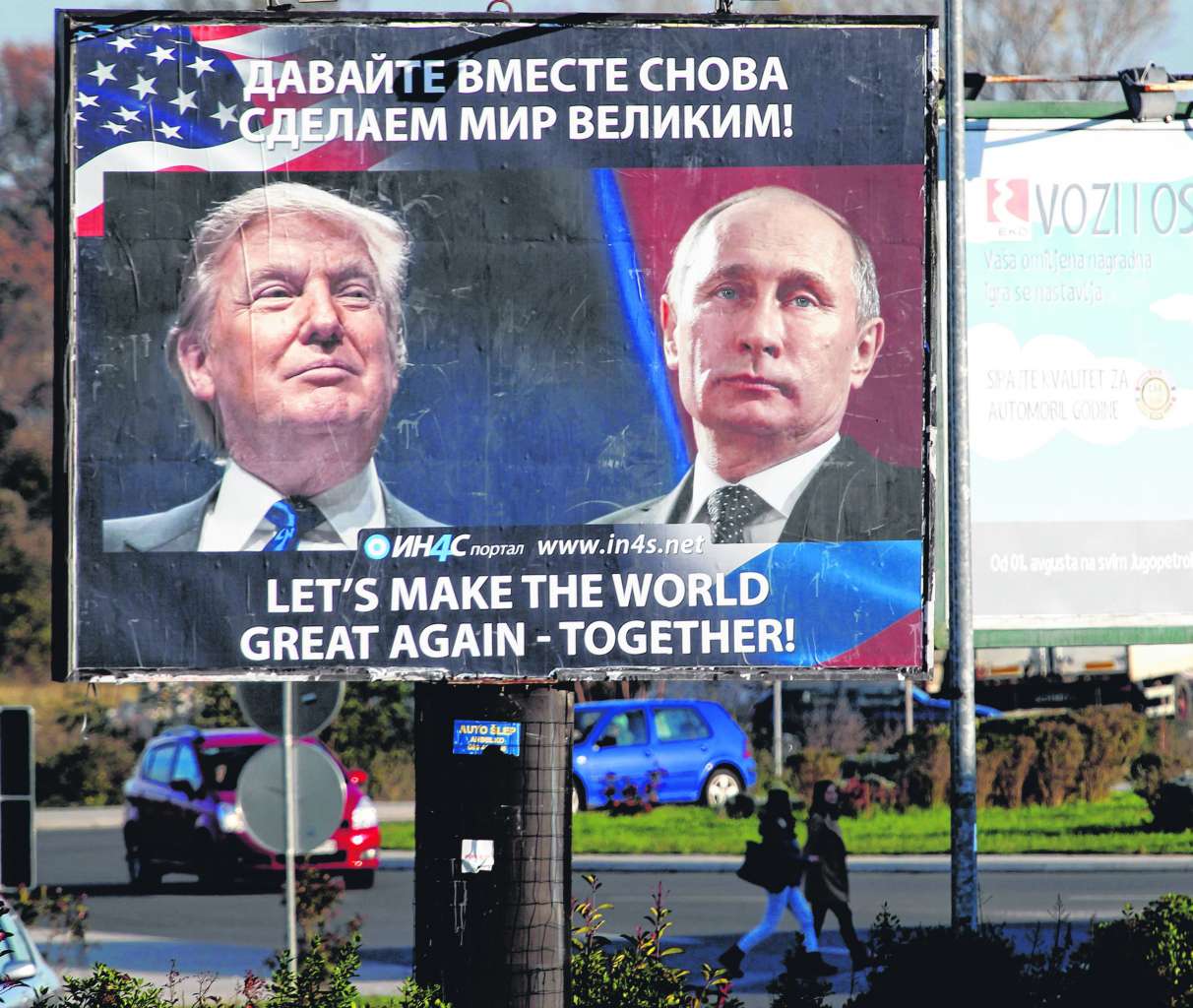 Pedestrians cross the street behind a billboard showing a pictures of US president-elect Donald Trump and Russian President Vladimir Putin in Danilovgrad, Montenegro, on Nov 16. 2016.