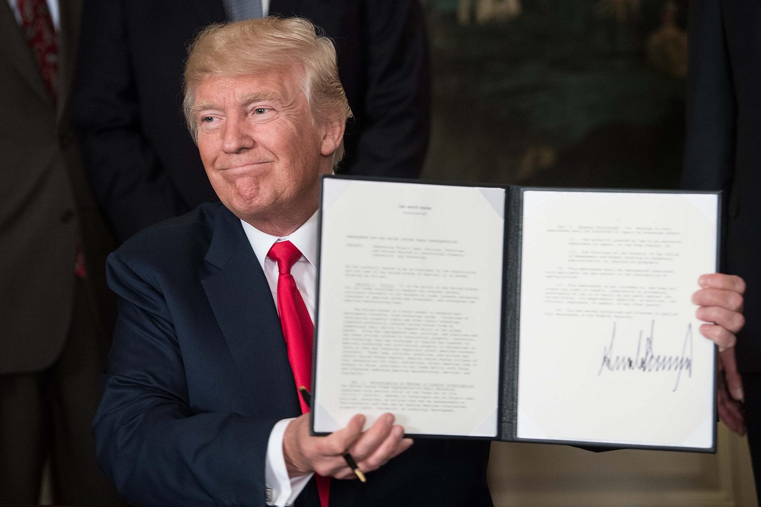 US President Donald Trump displays a memorandum on addressing China’s laws, policies, practices, and actions related to intellectual property, innovation, and technology on Aug 14, 2017.