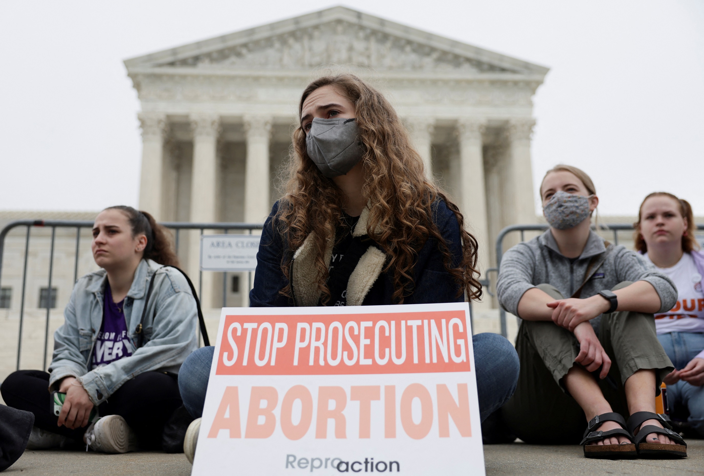 Protesters sit outside the US Supreme Court in Washington, on May 3, 2022.