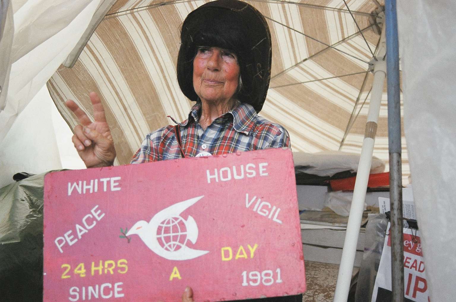 The diminutive weather-worn protester who manned a placard-festooned tent in front of 1600 Pennsylvania Avenue through Washington's brutal summers and winters since 1981 died on Monday, according to The Peace House, a group she belonged to.
