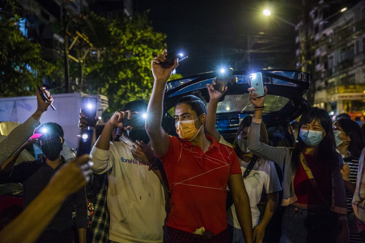 People flash their mobile phone lights while singing anti-military anthems in downtown Yangon on Feb. 3, 2021.