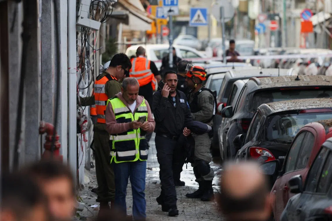 Emergency personnel working near a damaged building at an impact site, following a barrage of missiles launched from Iran, in Tel Aviv, Israel, on April 6.
