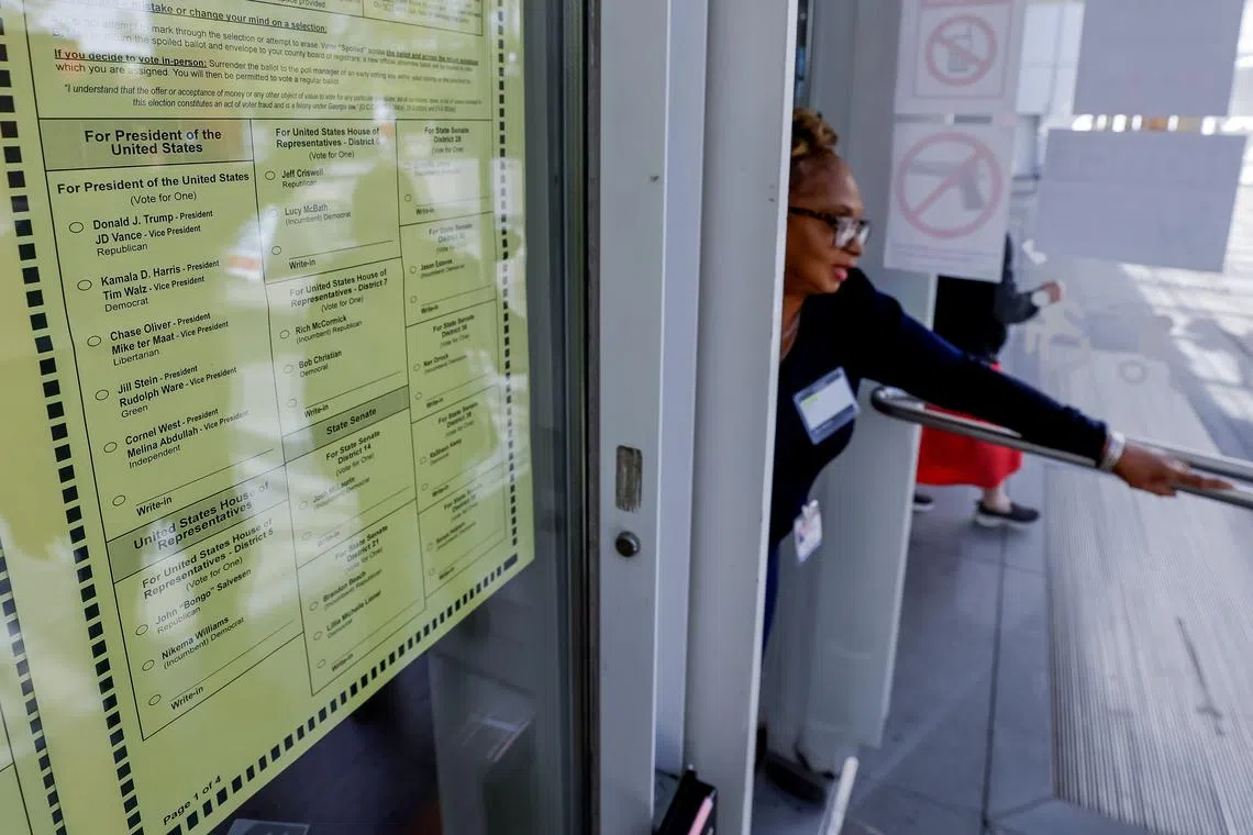 A poll worker opens the entry door to allow voters to cast their ballots during Advance Voting (Early Voting) in Georgia for the US presidential election on Oct 16.
