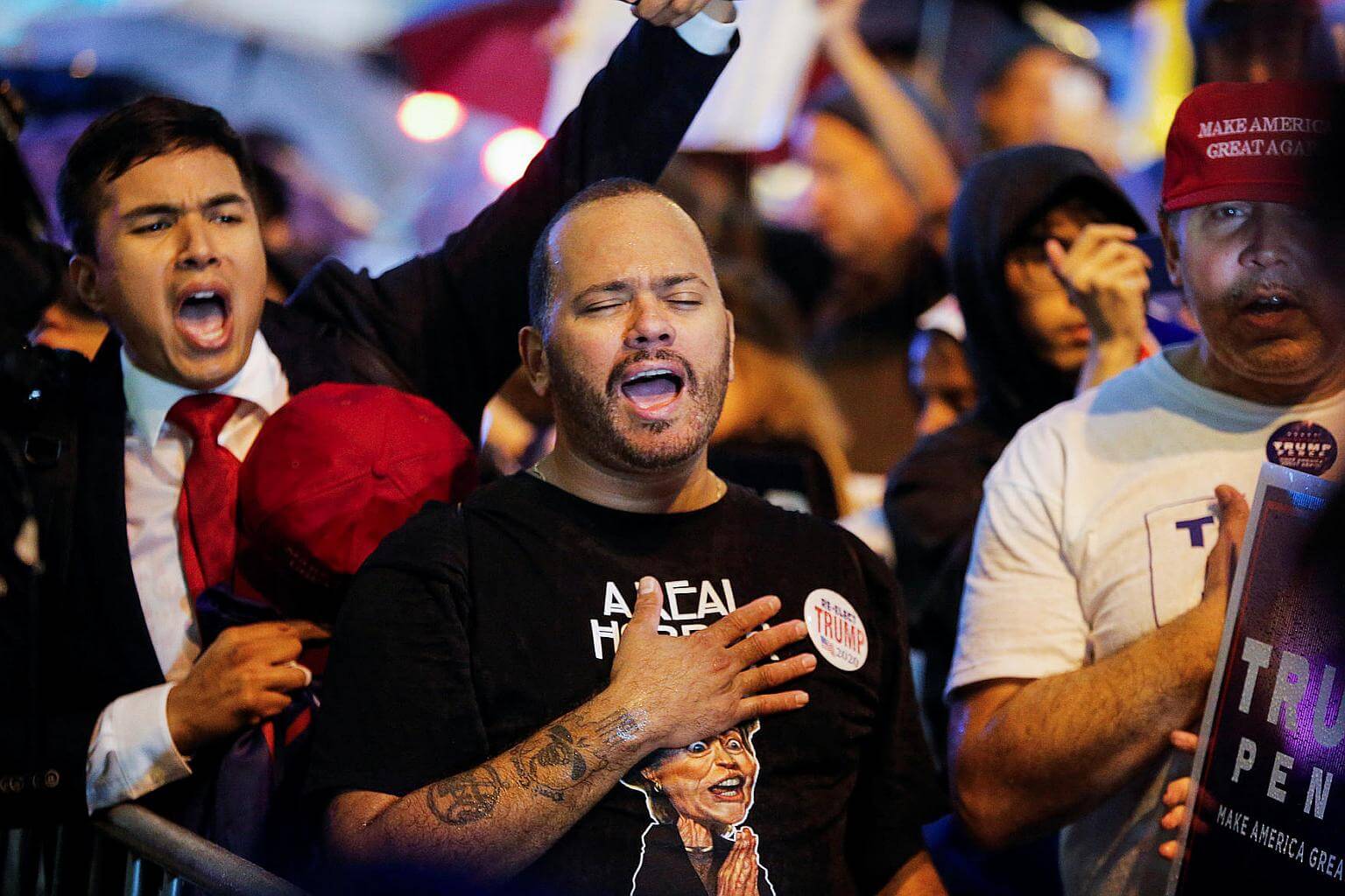 Supporters of Republican presidential nominee Donald Trump stand outside Trump Tower where Trump lives, in the Manhattan borough of New York on Oct 8, 2016.