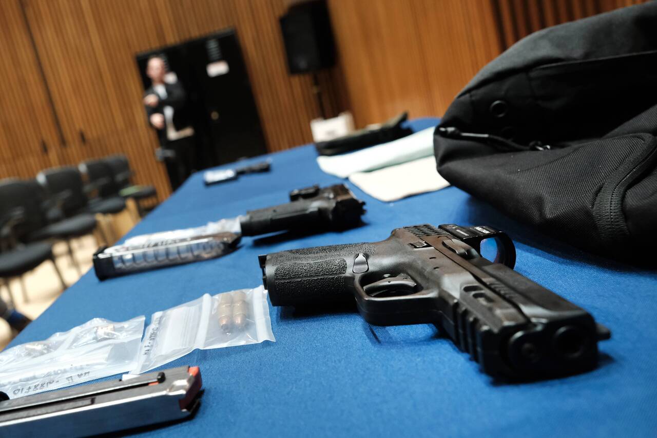Guns confiscated at New York public schools being displayed at a police news conference on May 25, 2022.