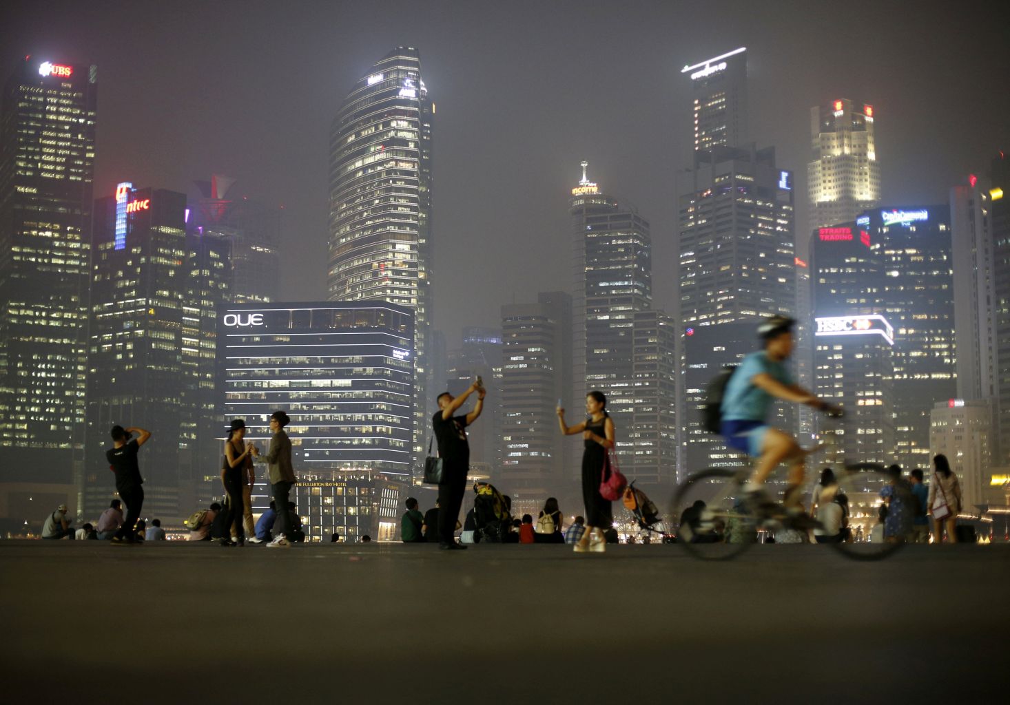 People taking photos against the skyline of the central business district in Singapore.