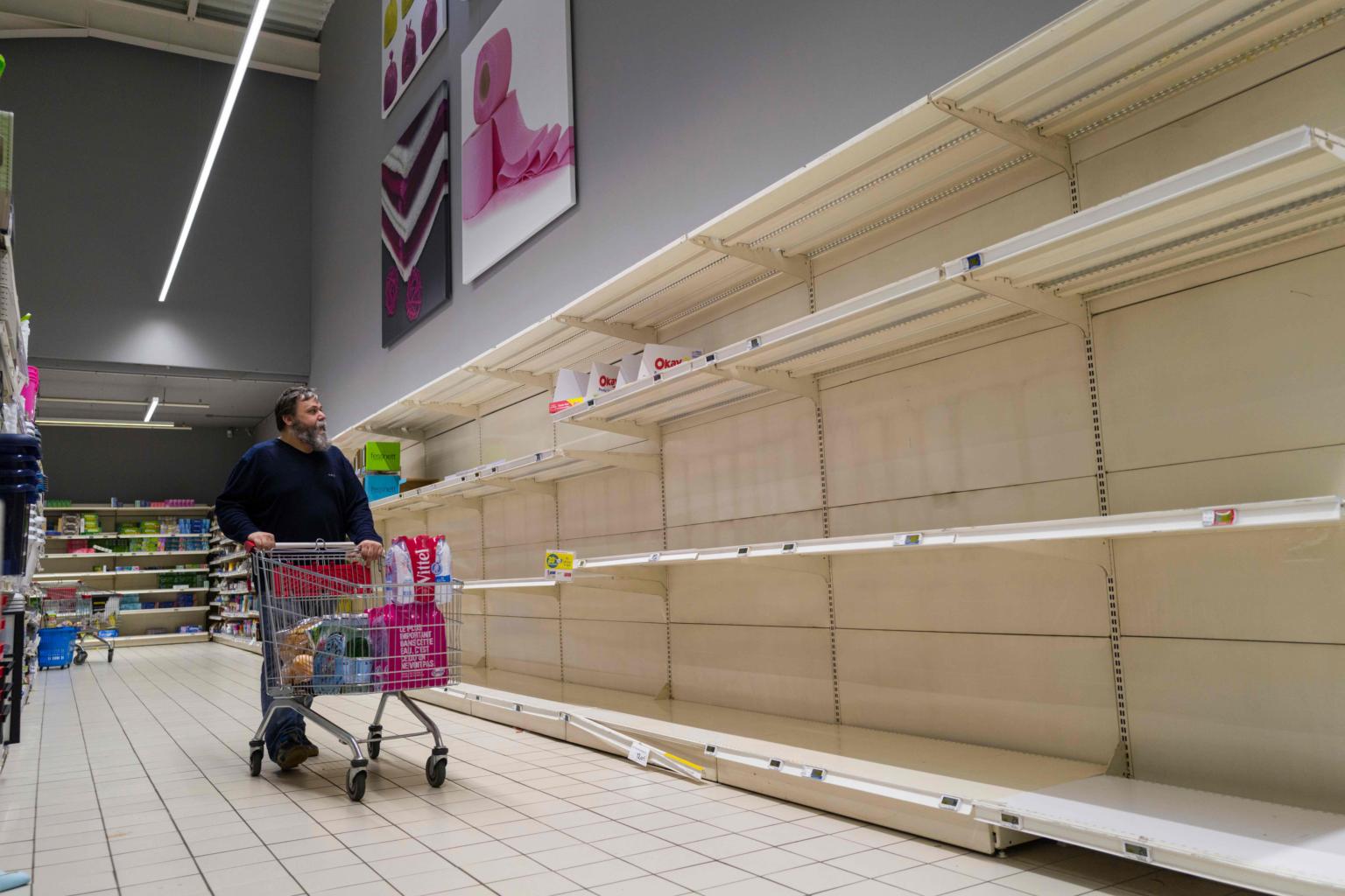 A man looks at empty shelves at the toilet paper section of a supermarket in France on March 16, 2020.