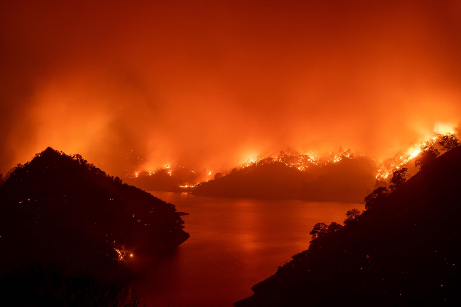 Flames surround Lake Berryessa in Napa, California on Aug 19, 2020.