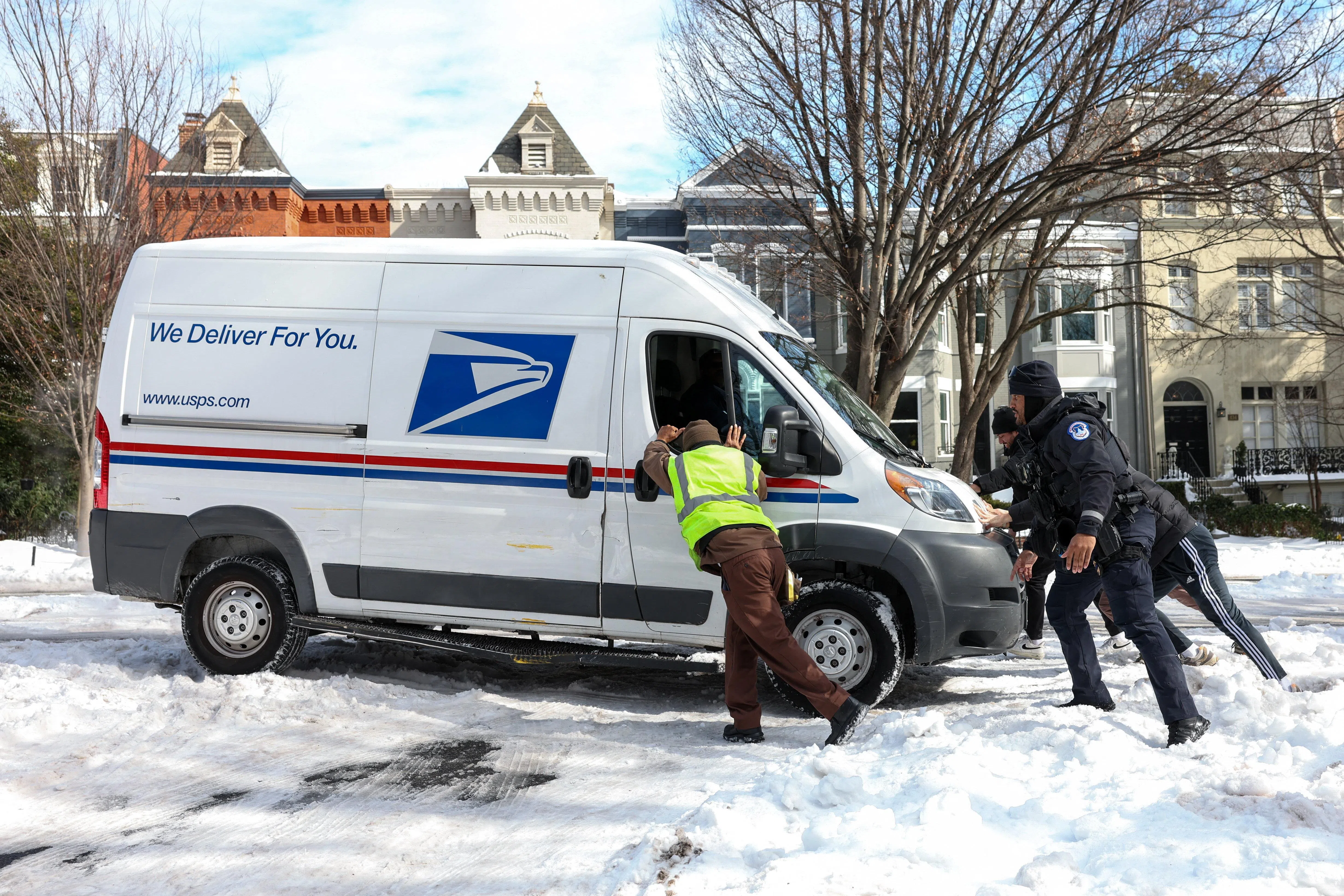 People helping to push a US Postal Service van out of snow and ice in Washington on Jan 27.