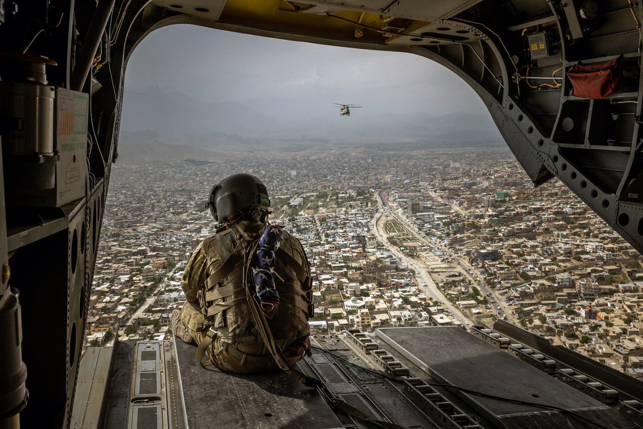 A photo from May 2, 2021, shows a US soldier on a CH-47 Chinook helicopter flying over Kabul, Afghanistan.
