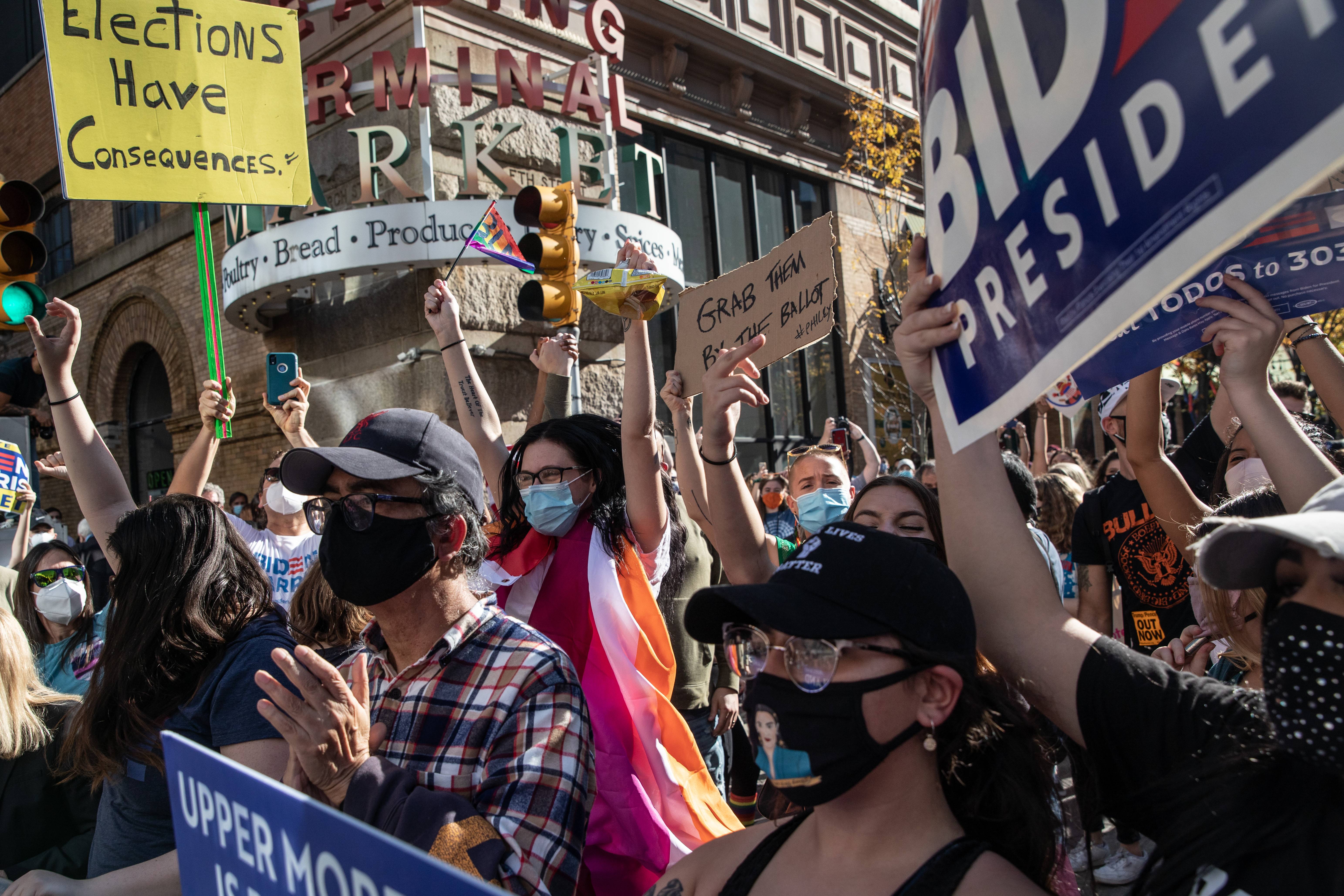 Streets were closed to traffic as Biden supporters marched with an assortment of LGBTQ, Black Lives Matter and American flags. Some carried a giant balloon of Trump in the shape of a rat.