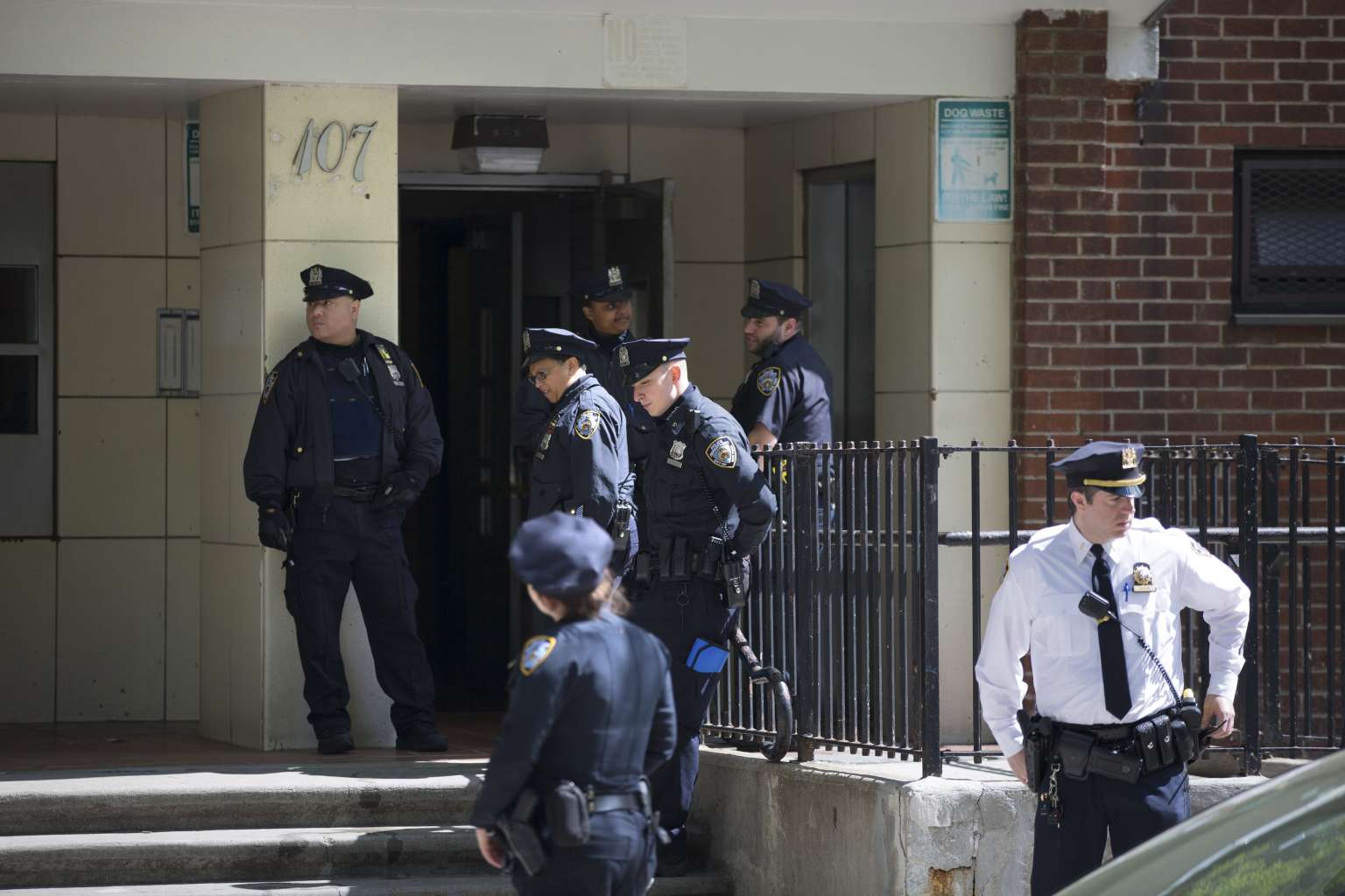 Officers outside the apartment building in the East Harlem neighbourhood of New York.