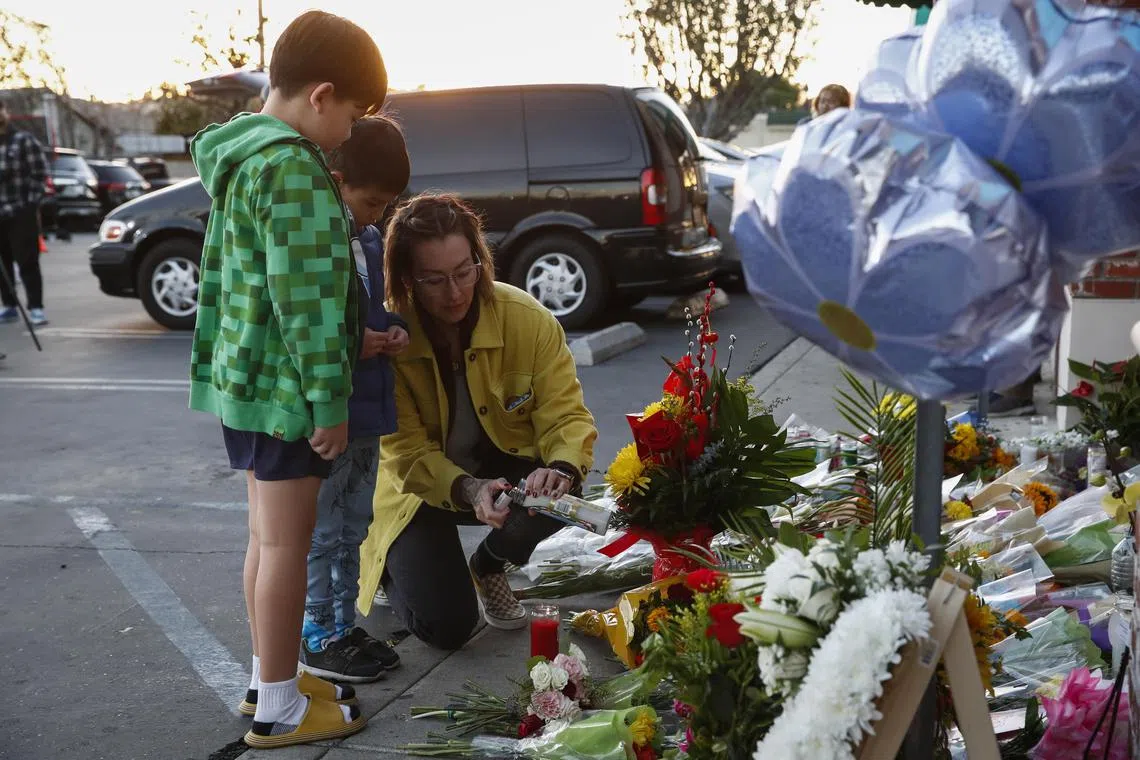 People visit a makeshift memorial outside of Star Dance Studio in Monterey Park, California on Jan 23.