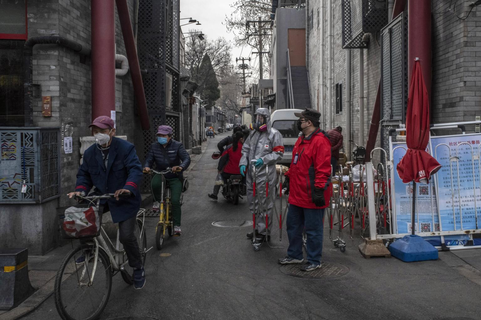 Members of a neighborhood committee check temperatures and IDs in Beijing on March 18, 2020.