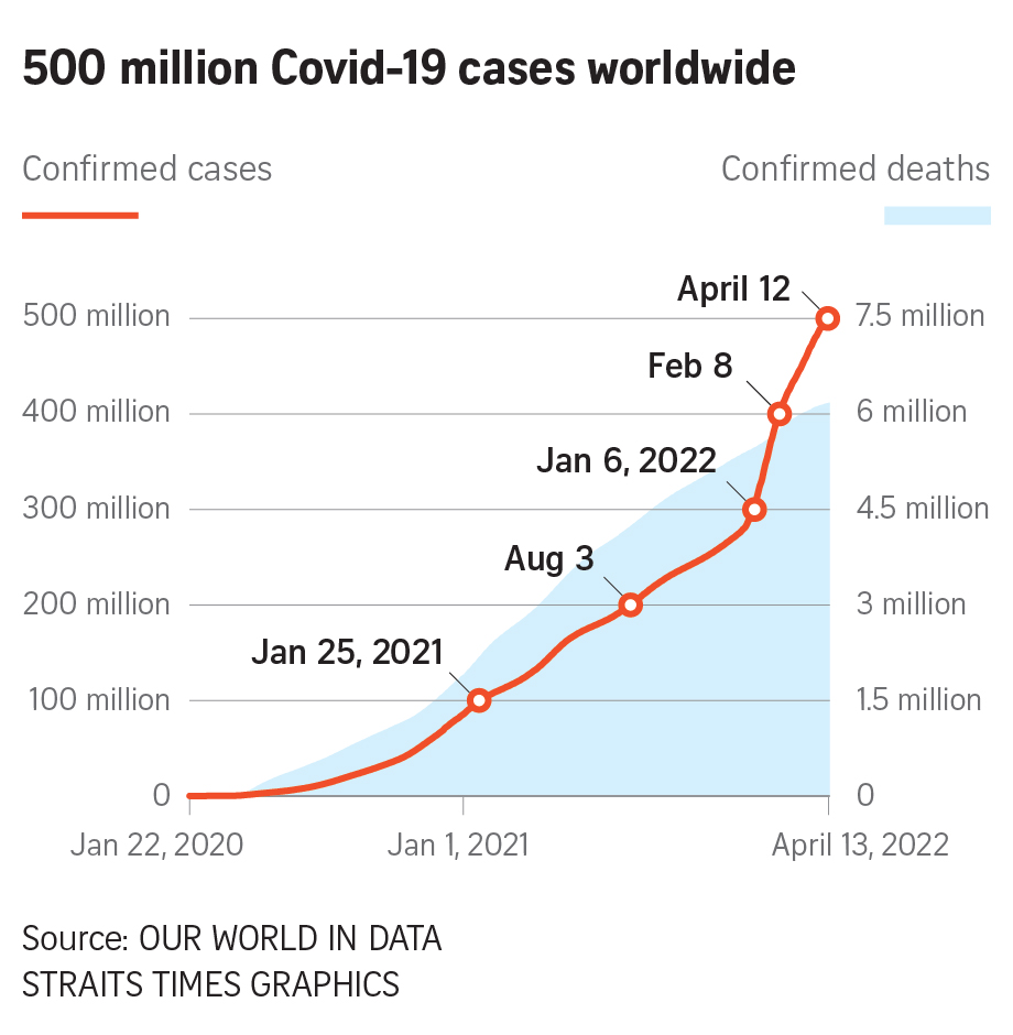 NEW YORK (NYTIMES) - The coronavirus is continuing to stalk the world at an astonishing clip, racing past a grim succession of pandemic milestones this year: totals of 300 million known cases around the world by early January, 400 million by early February and, as of Tuesday (April 12), half a billion.