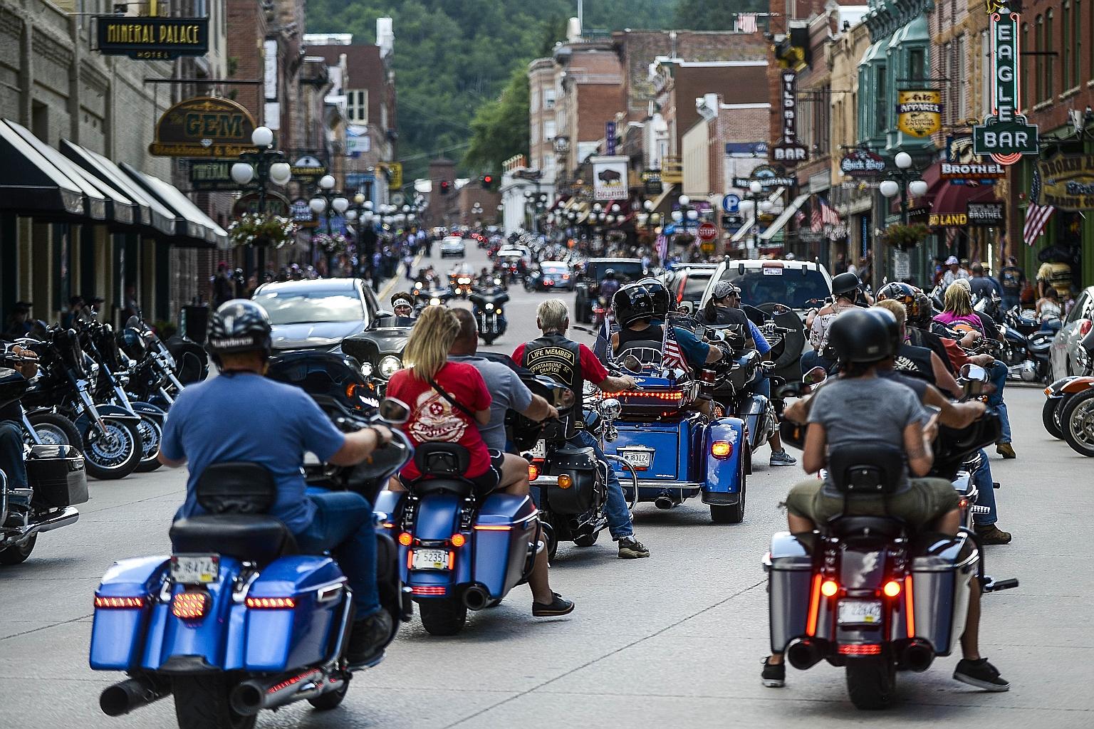 Motorcyclists riding through Deadwood, South Dakota, during the 80th Annual Sturgis Motorcycle Rally on Aug 8. Many cases in North and South Dakota have been linked to the rally that attracts hundreds of thousands each year.