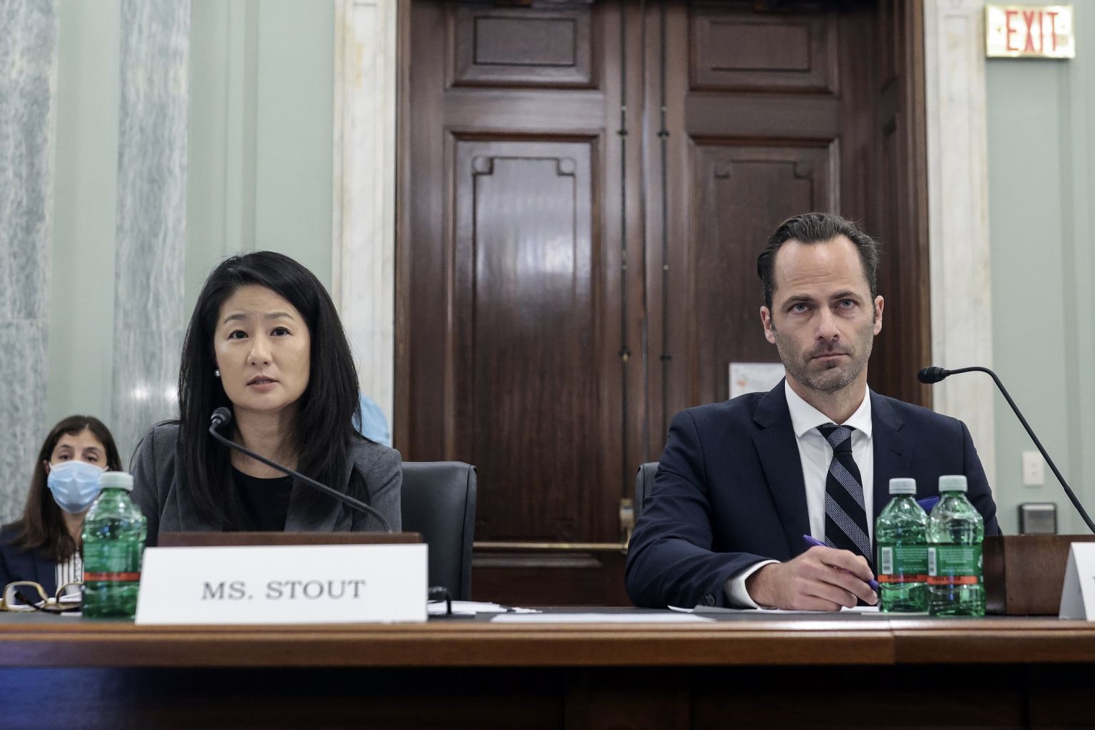 Snap's Jennifer Stout (left) and TikTok's Michael Beckerman testify before a Senate hearing over mounting concerns that their platforms can harm children and teenagers.