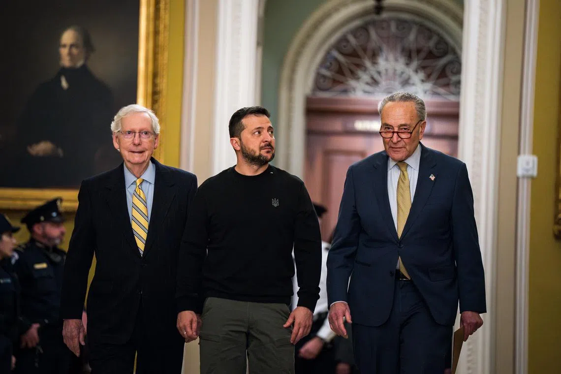 Ukrainian President Volodymyr Zelensky (centre) being received by Senate Majority Leader Chuck Schumer (right) and Senate Minority Leader Mitch McConnell at the US Capitol on Dec 12.