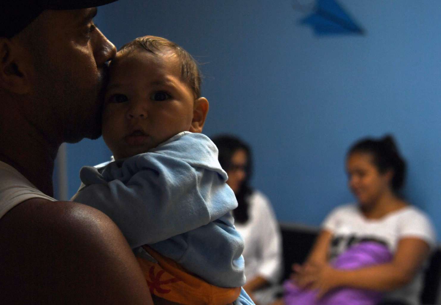 Paulo Sergio holds his six-month-old baby Arthur Meneses as they wait for medical exams in Brazil. Arthur's mother was infected with the Zika virus while pregnant.