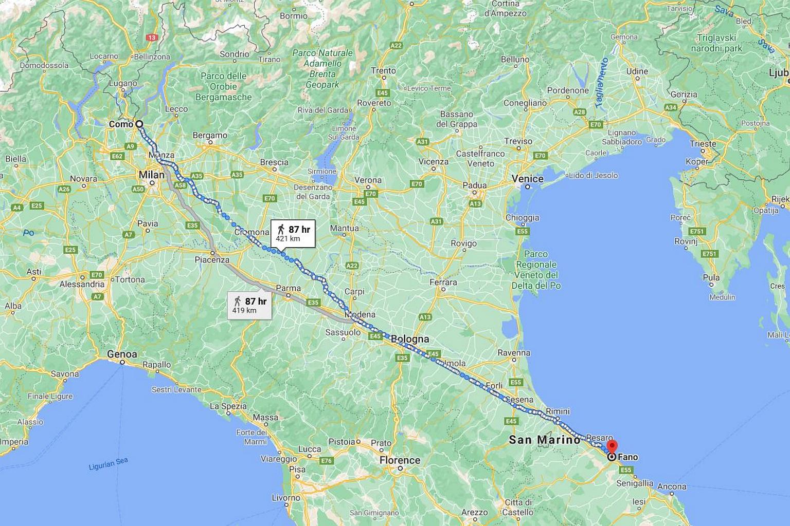 A screenshot of Google Maps showing the possible walking trail from the city of Como in northern Italy to the seaside town of Fano.