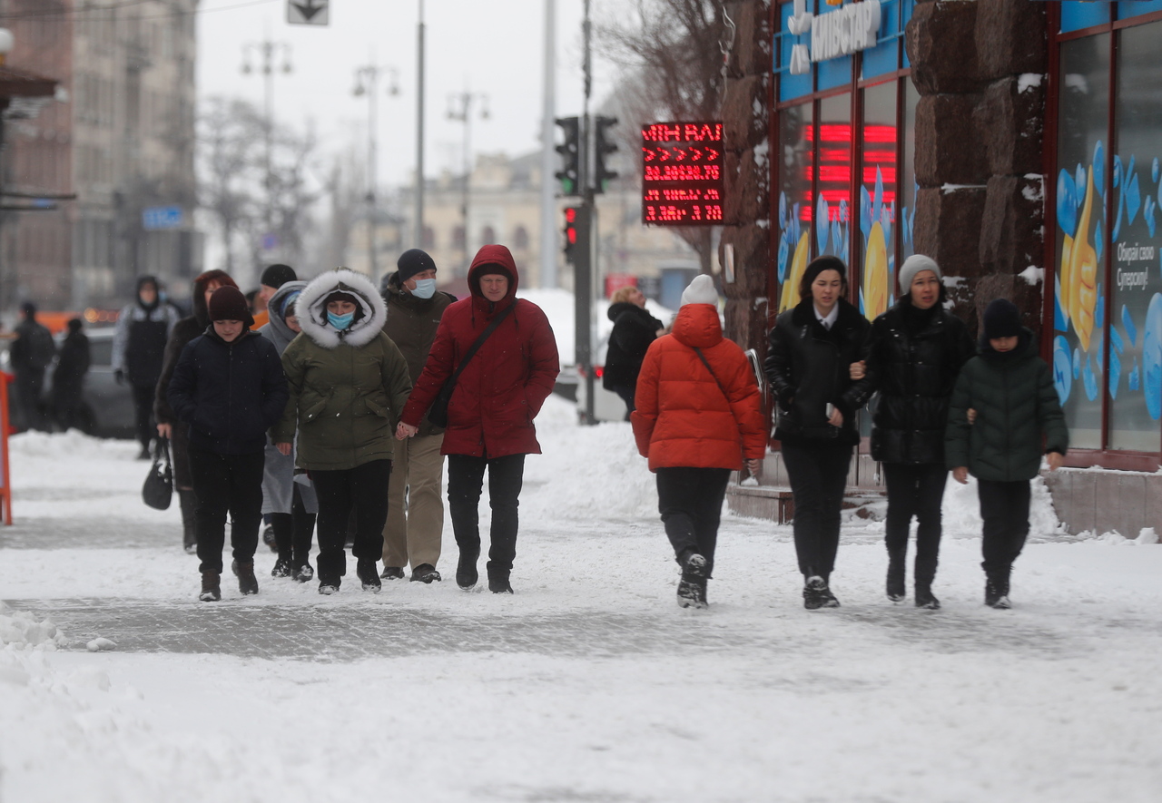 People walk in a street during snowfall in downtown Kiev, Ukraine, on Jan 30, 2022.