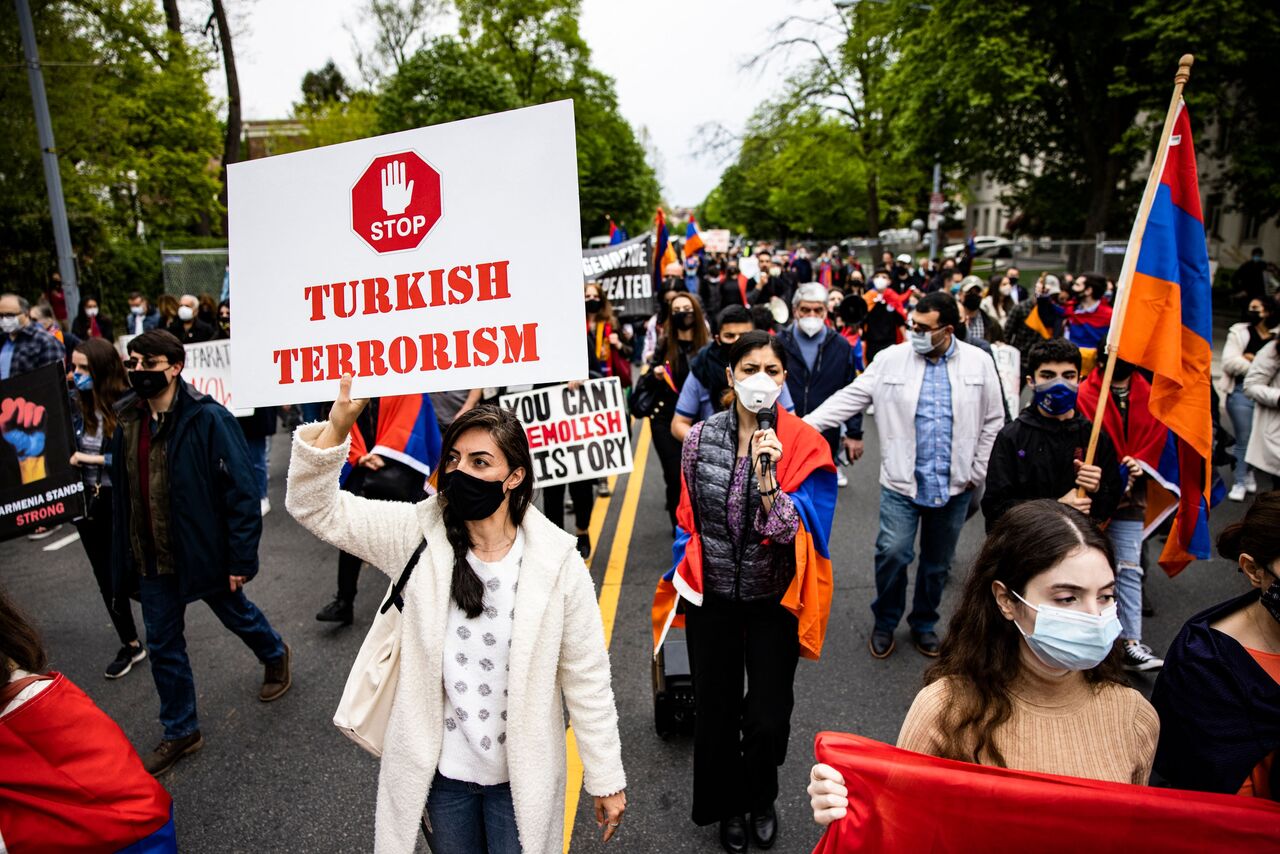 Armenians march towards the Turkish embassy during a protest in Washington, DC, on April 24, 2021.