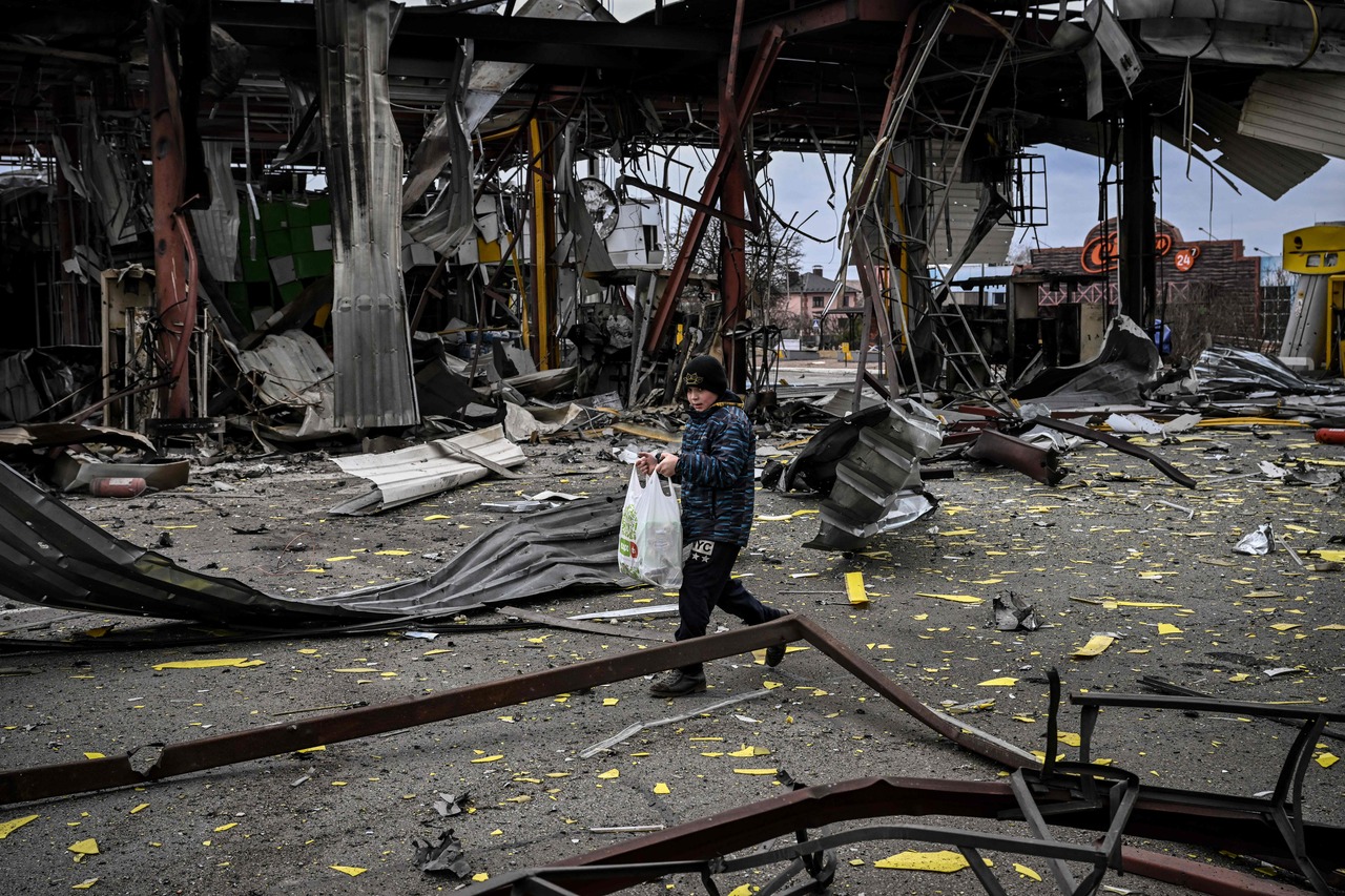A child evacuates the city of Irpin, northwest of Kyiv, during heavy shelling and bombing on March 5, 2022.