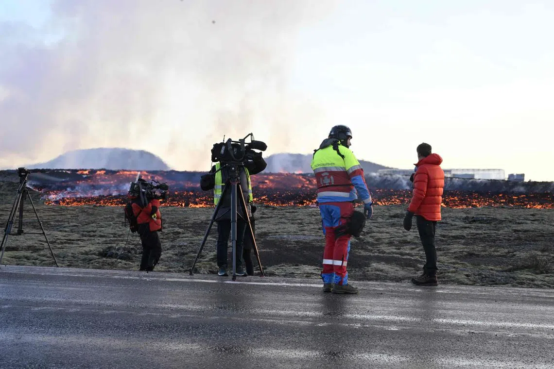Media and emergency personnel watch as flowing lava approaches a road on the outskirts of the Icelandic town of Grindavik.