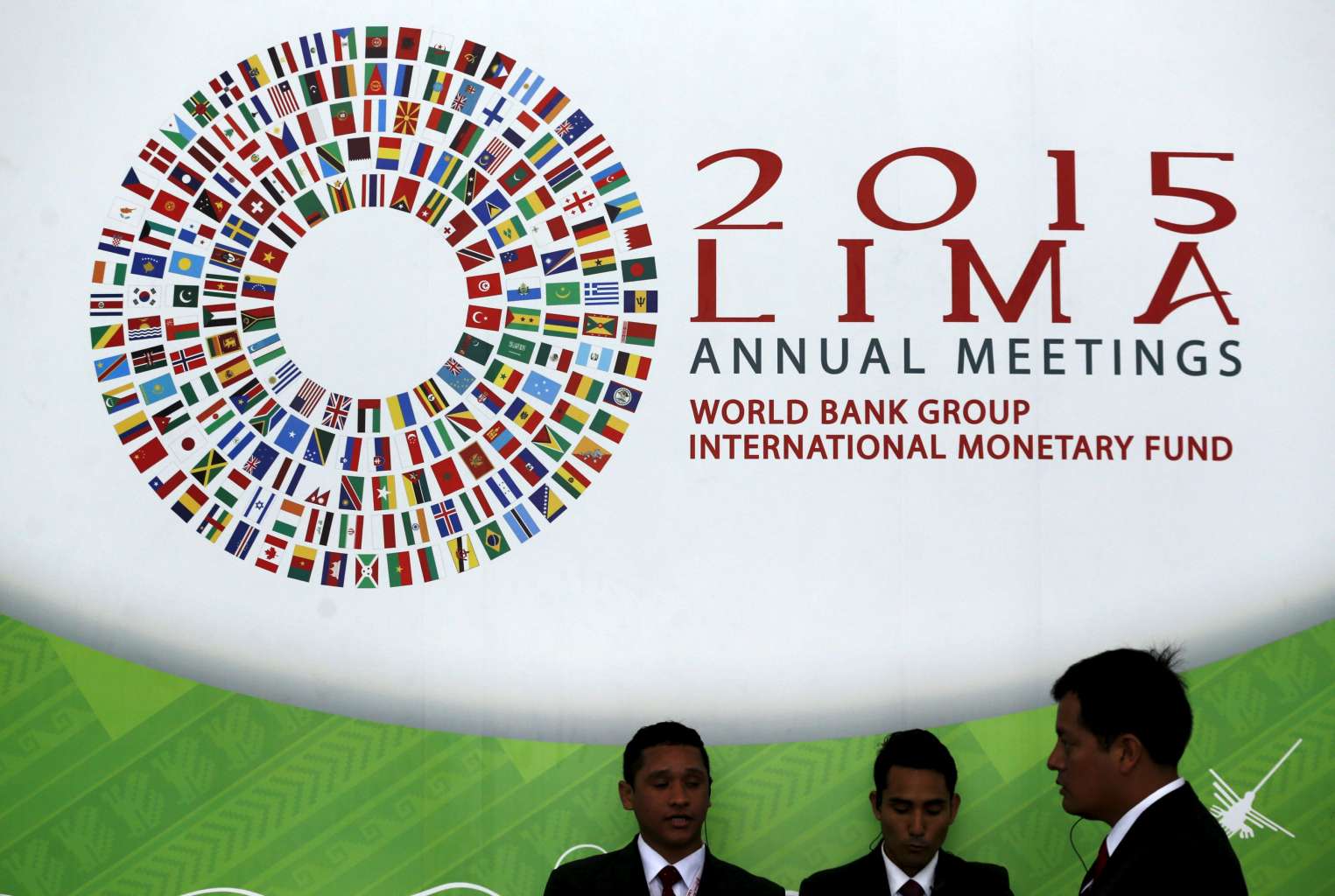 People stand near a welcome sign to the 2015 IMF/World Bank annual meetings in Lima.