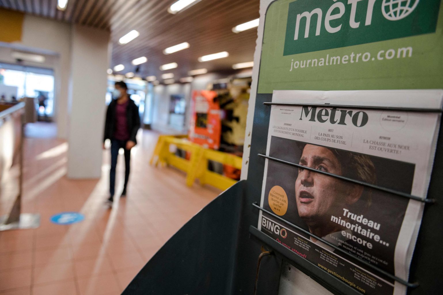 A newspaper shows a cover photo of Canadian Prime Minister Justin Trudeau, at the Jarry Metro station in Montreal, Quebec.