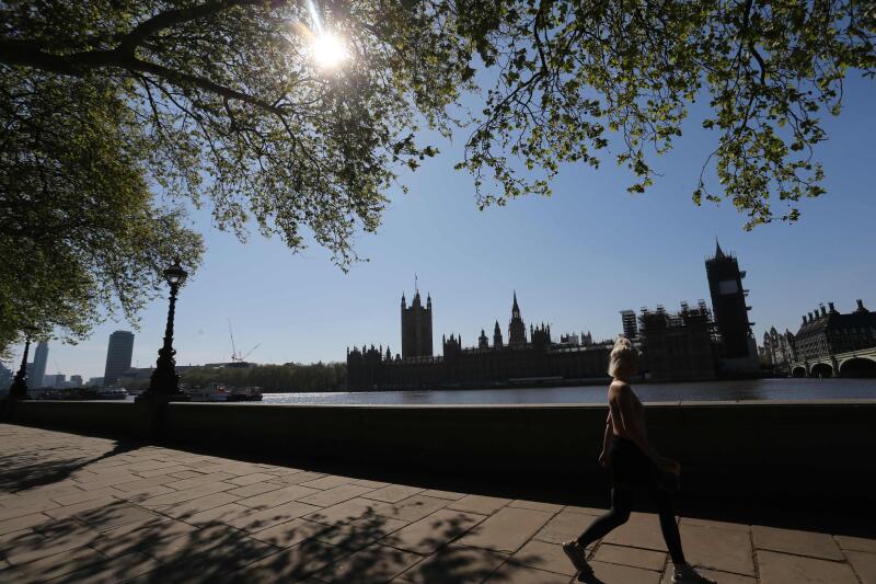 A woman walks along the embankment near the Houses of Parliament in Westminster, London, on April 21, 2020.