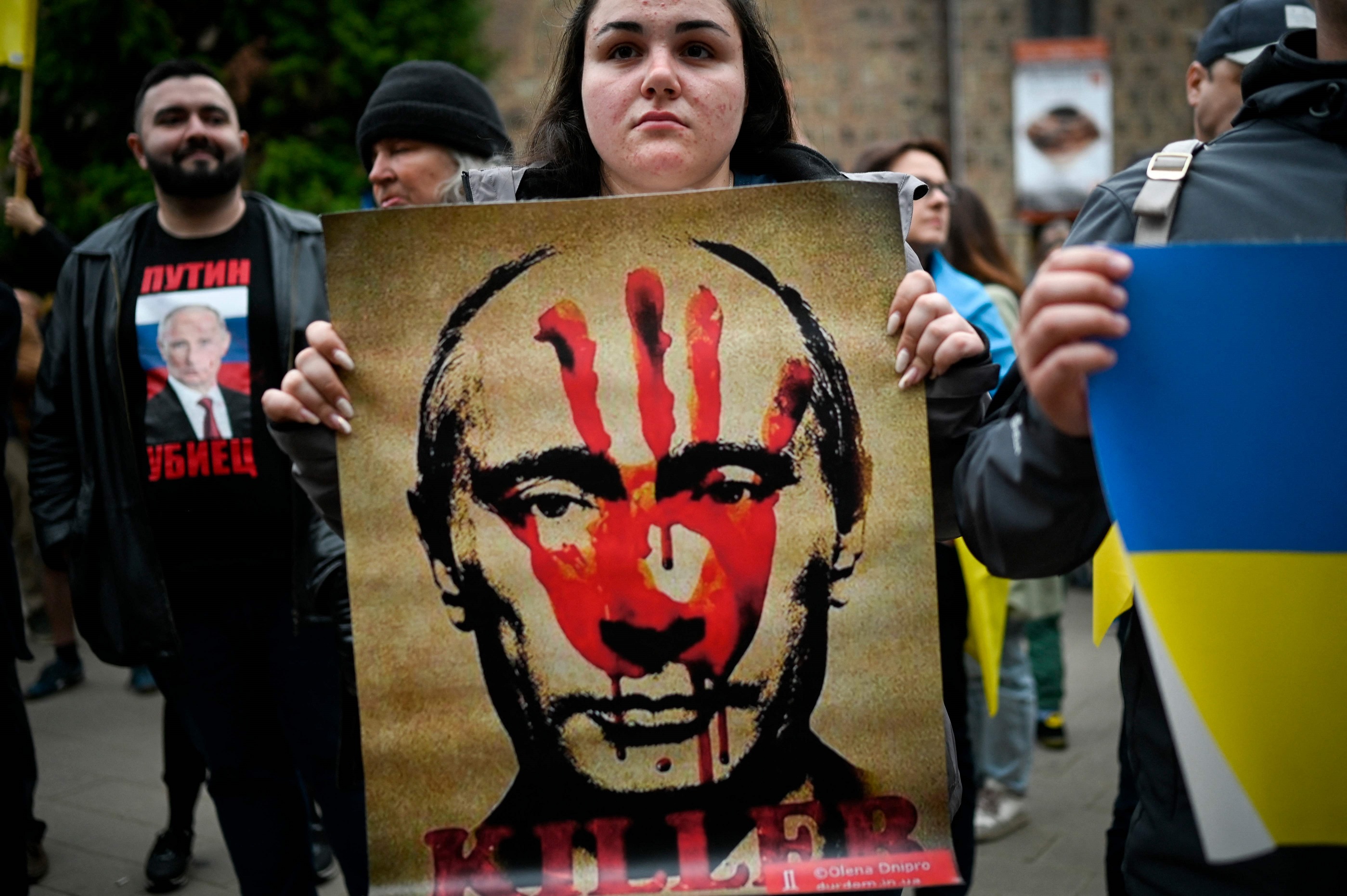 A woman holds an image depicting Russian President Vladimir Putin and reading "killer", during a pro-Ukraine protest in Bulgaria.