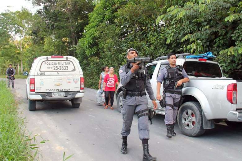 Military police officers track fugitives after a riot in a prison in Manaus, Amazonia state, Brazil on Jan 2, 2017.