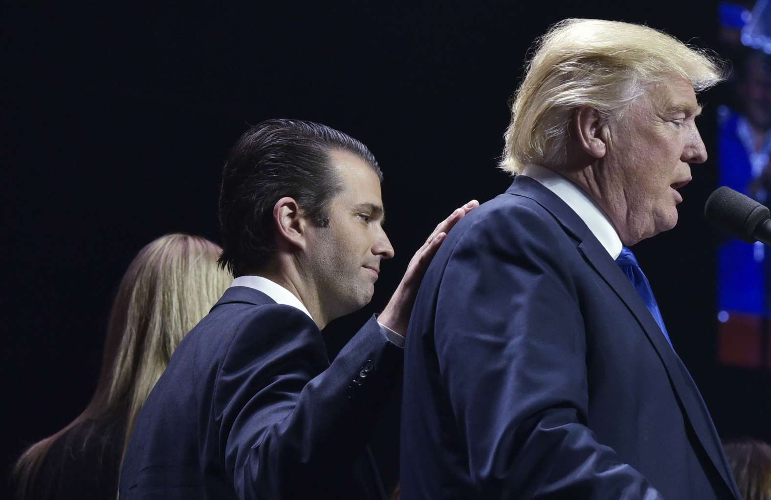 Donald Trump, Jr. places a hand on the shoulder of his father, former Republican presidential nominee Donald Trump, during in a rally at the SNHU Arena in Manchester, New Hampshire on Nov 7, 2016.