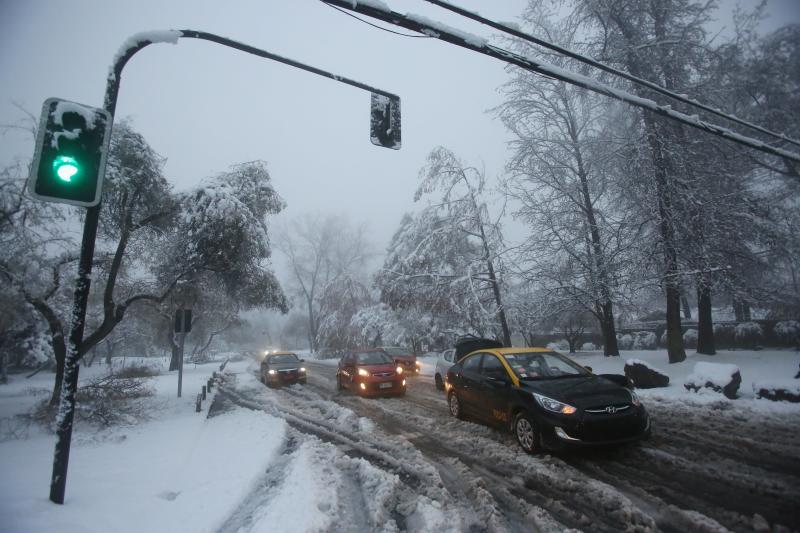 Vehicles on a snow covered road in Santiago, Chile, July 15, 2017.