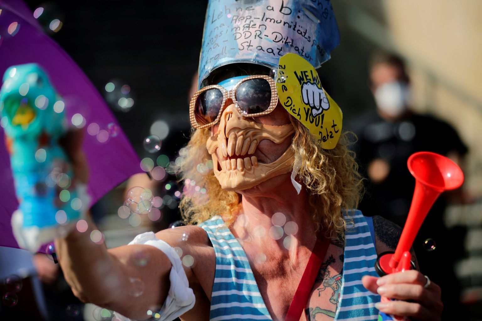 A woman wears a mask as activists protest against coronavirus restrictions in Berlin, Germany, July 18, 2020.