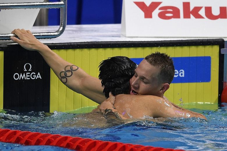 Joseph Schooling embracing Caeleb Dressel, who was a class above the rest in the 100m butterfly final. The American swam 49.86sec, just 0.04 off the world record, to win his fifth gold.