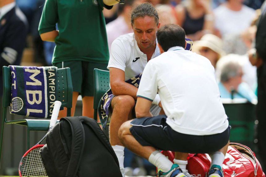 Federer reached the Wimbledon second round when Alexandr Dolgopolov quit when trailing 6-3, 3-0 after just 43 minutes on Centre Court complaining of an ankle injury. Earlier, title rival Novak Djokovic booked his second round spot in just 40 minutes when Martin Klizan, suffering from a calf injury, retired at 6-3, 2-0 down.