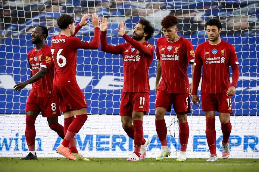 Liverpool remained on course for a Premier League record points tally thanks to two goals from Mohamed Salah to win 3-1 at Brighton on Wednesday.