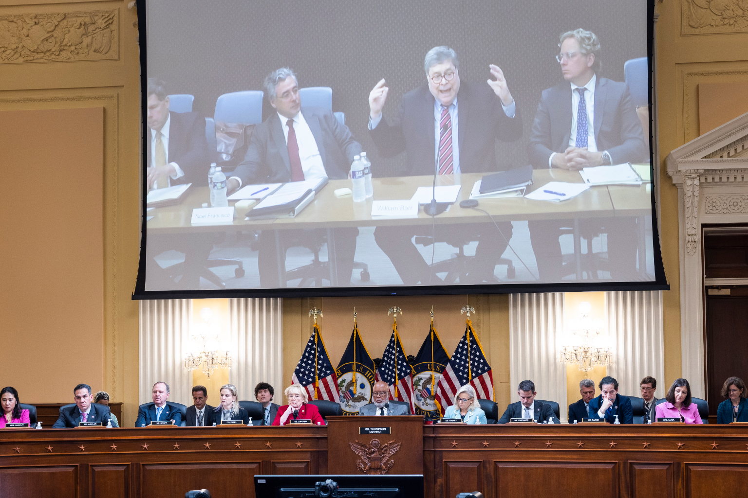 Former Attorney-General William Barr is seen on a screen above the select committee during a hearing on June 13, 2022.