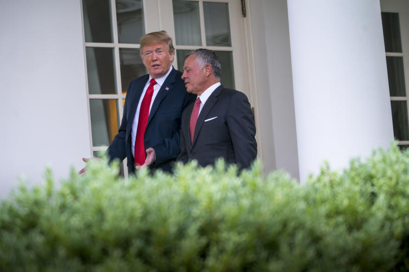 President Donald Trump and King Abdullah II bin Al-Hussein of Jordan speak as they walk to their meeting in the Oval Office of the White House in Washington, on June 25, 2018.