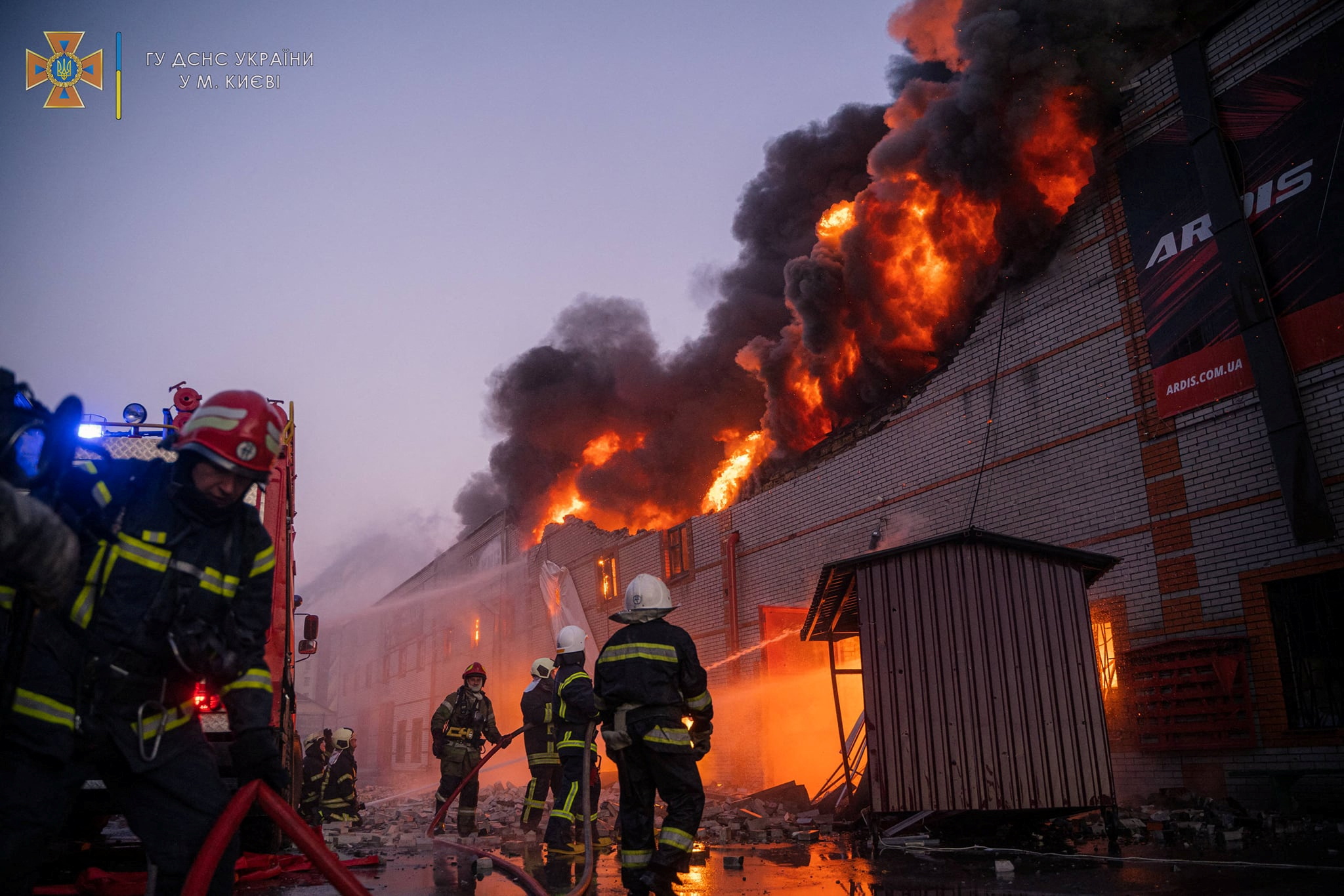 A handout photo shows fire-fighters working at the site of buildings damaged by a shelling, in Kyiv, on March 17, 2022.