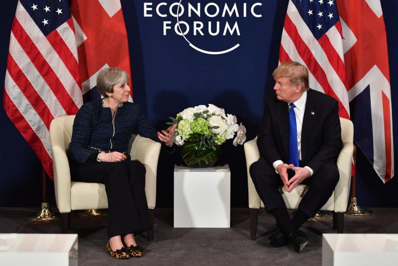 US President Donald Trump and Britain's Prime Minister Theresa May speak during a bilateral meeting on the sidelines of the World Economic Forum annual meeting in Davos, eastern Switzerland, on Jan 25, 2018.