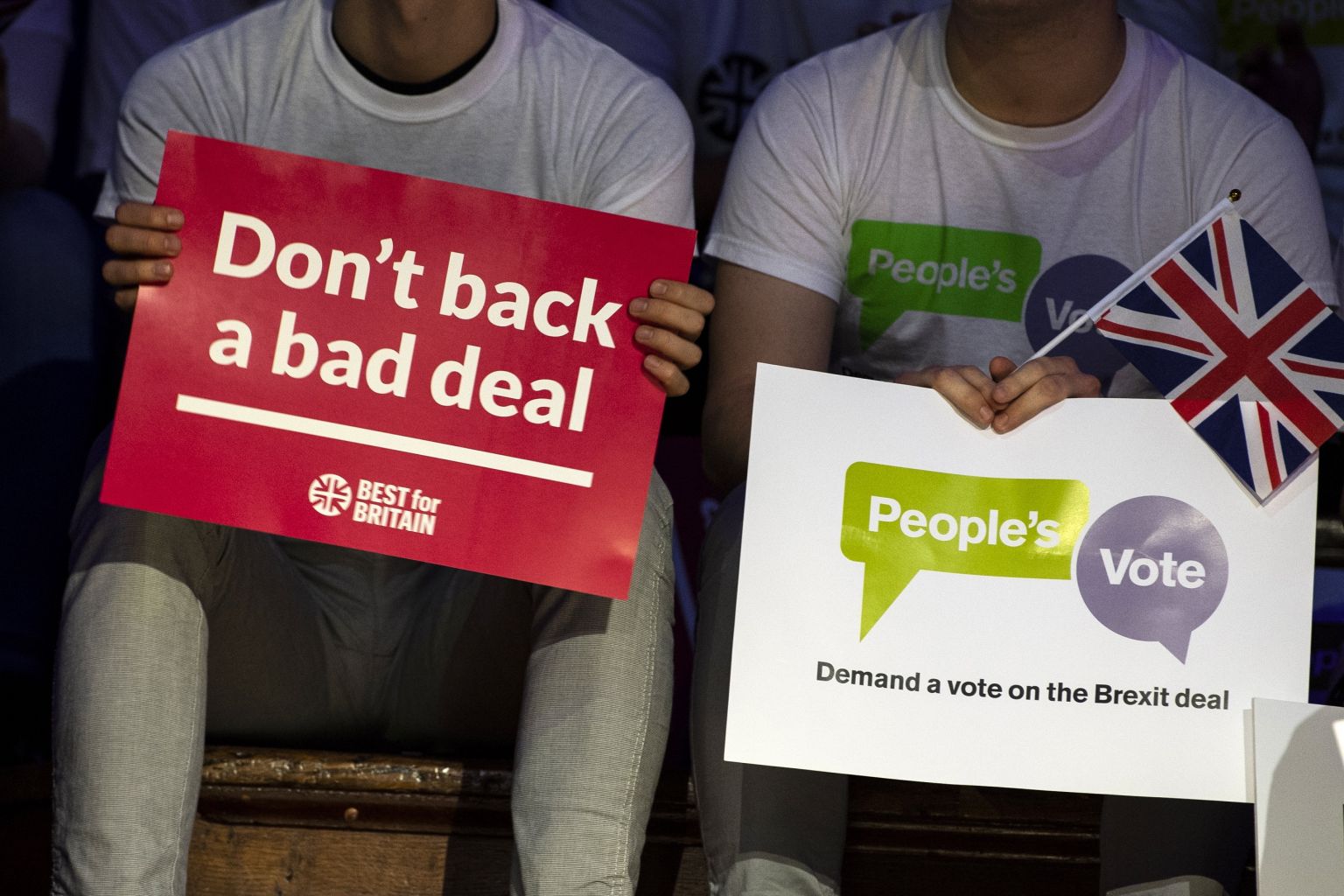 Supporters hold placards during a "People's Vote" rally in central London, Nov 13, 2018.