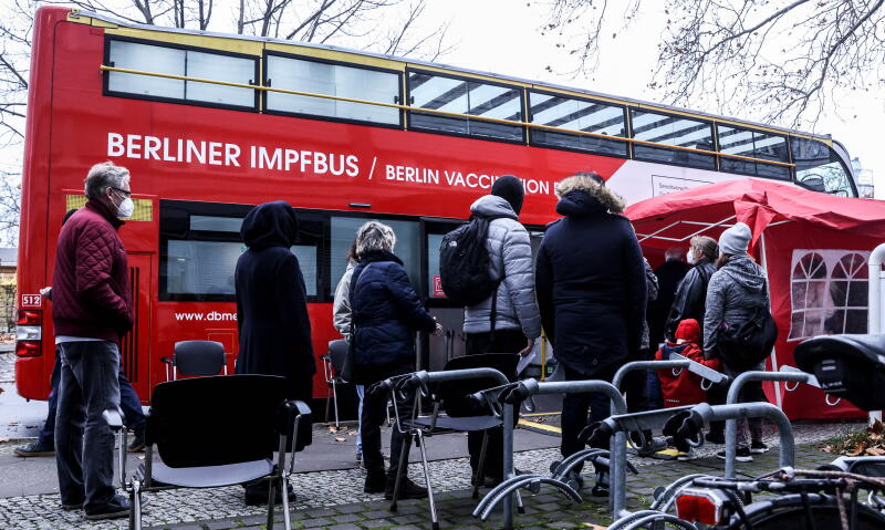 People wait in line to be vaccinated against coronavirus, in front of a vaccination bus in Berlin, Germany, on Nov 19, 2021.