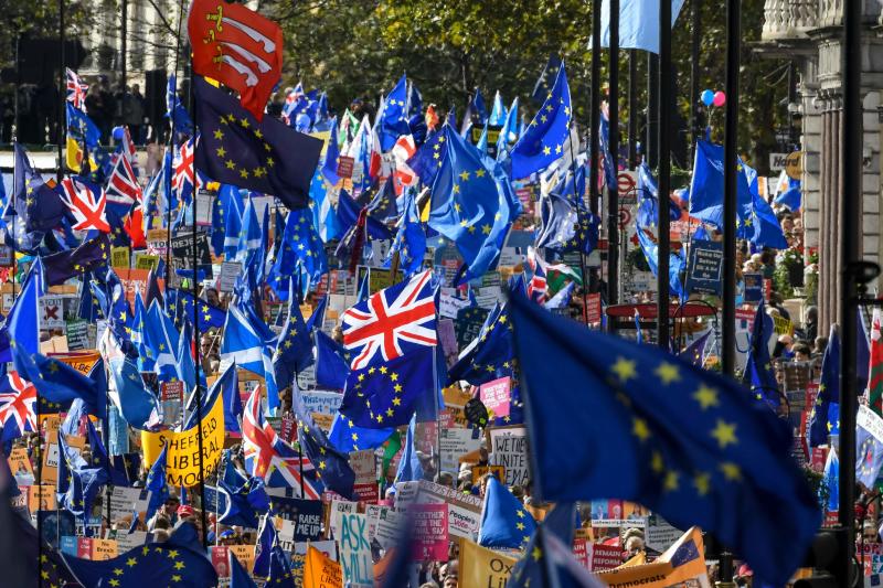 Demonstrators hold placards and EU and Union flags as they take part in a march by the People's Vote organisation in central London on Oct 19, 2019, calling for a final say in a second referendum on Brexit.
