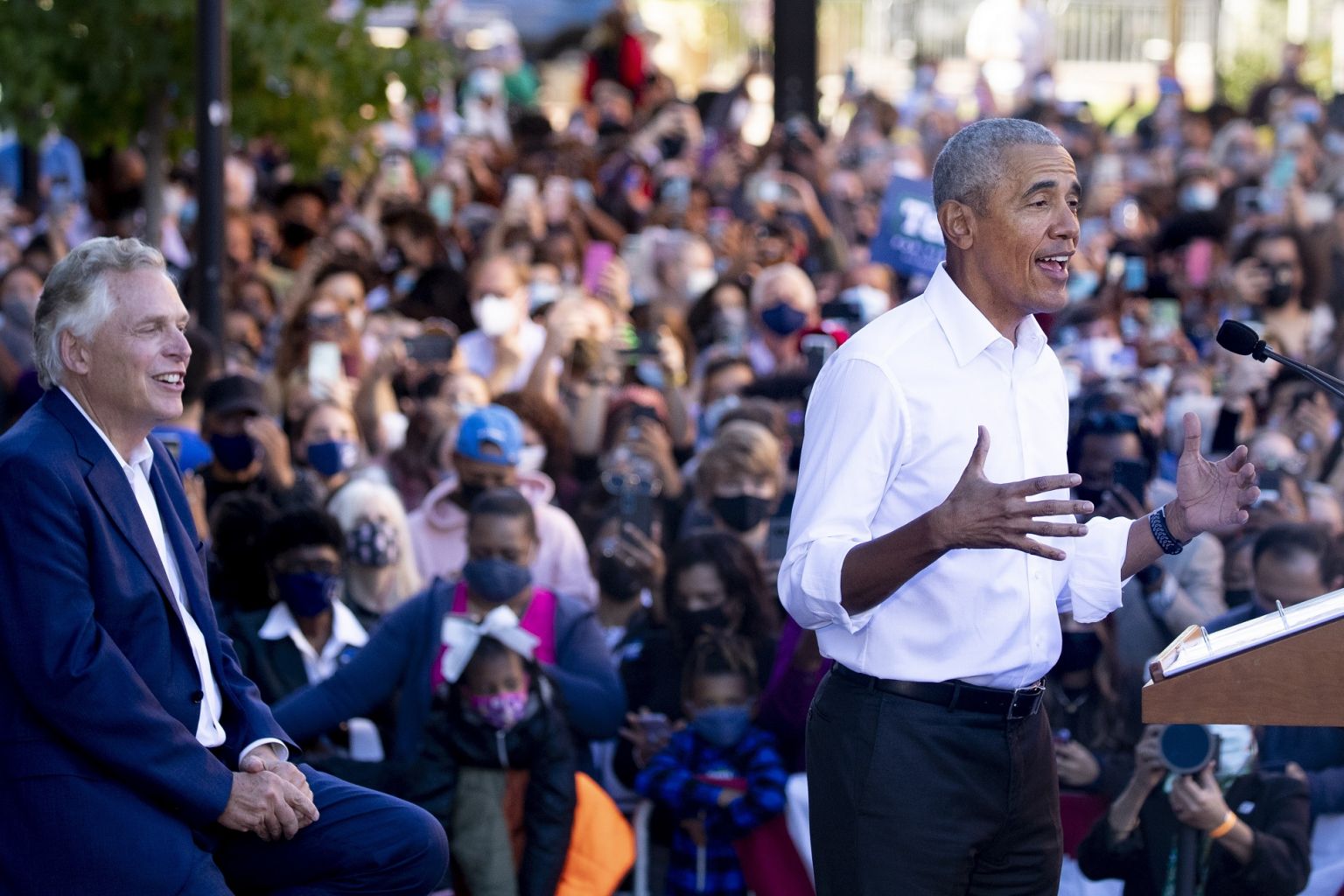 Former US president Barack Obama (right) speaks at a campaign event for Virginia gubernatorial candidate Terry McAuliffe (left), in Richmond, Virginia.