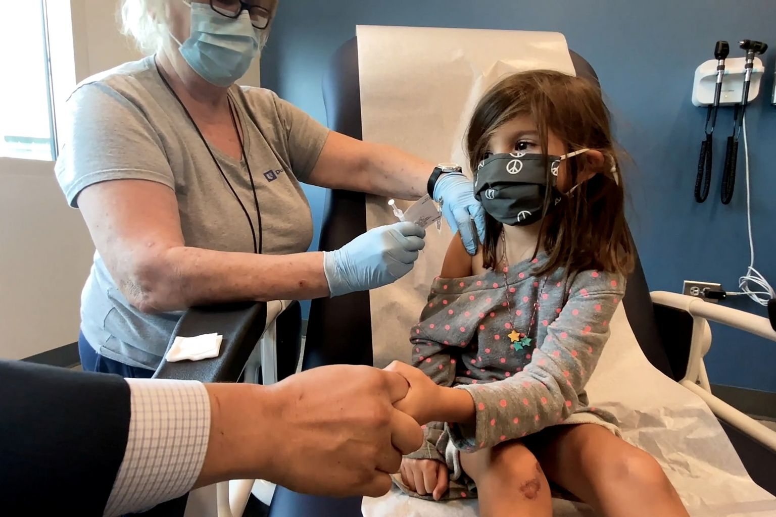 A girl aged five holds her dad's hand as she is injected with the Pfizer vaccine as part of a trial at the US' Duke University.