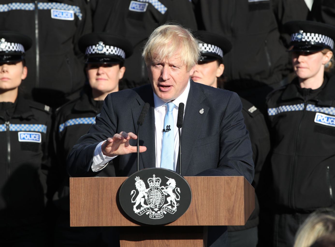 Boris Johnson speaks during a visit with the police in West Yorkshire, northern England.