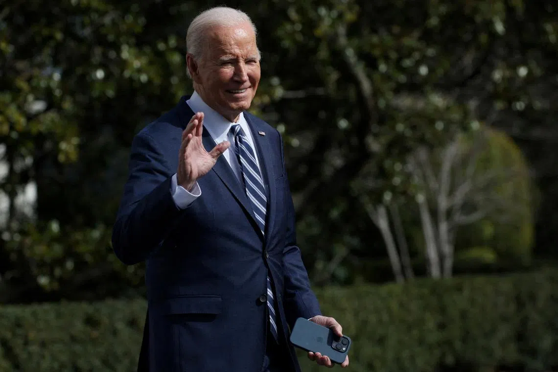 US President Joe Biden waving to members of the media on his way to board Marine One to travel to Ohio from the South Lawn of the White House in Washington on Feb 16.
